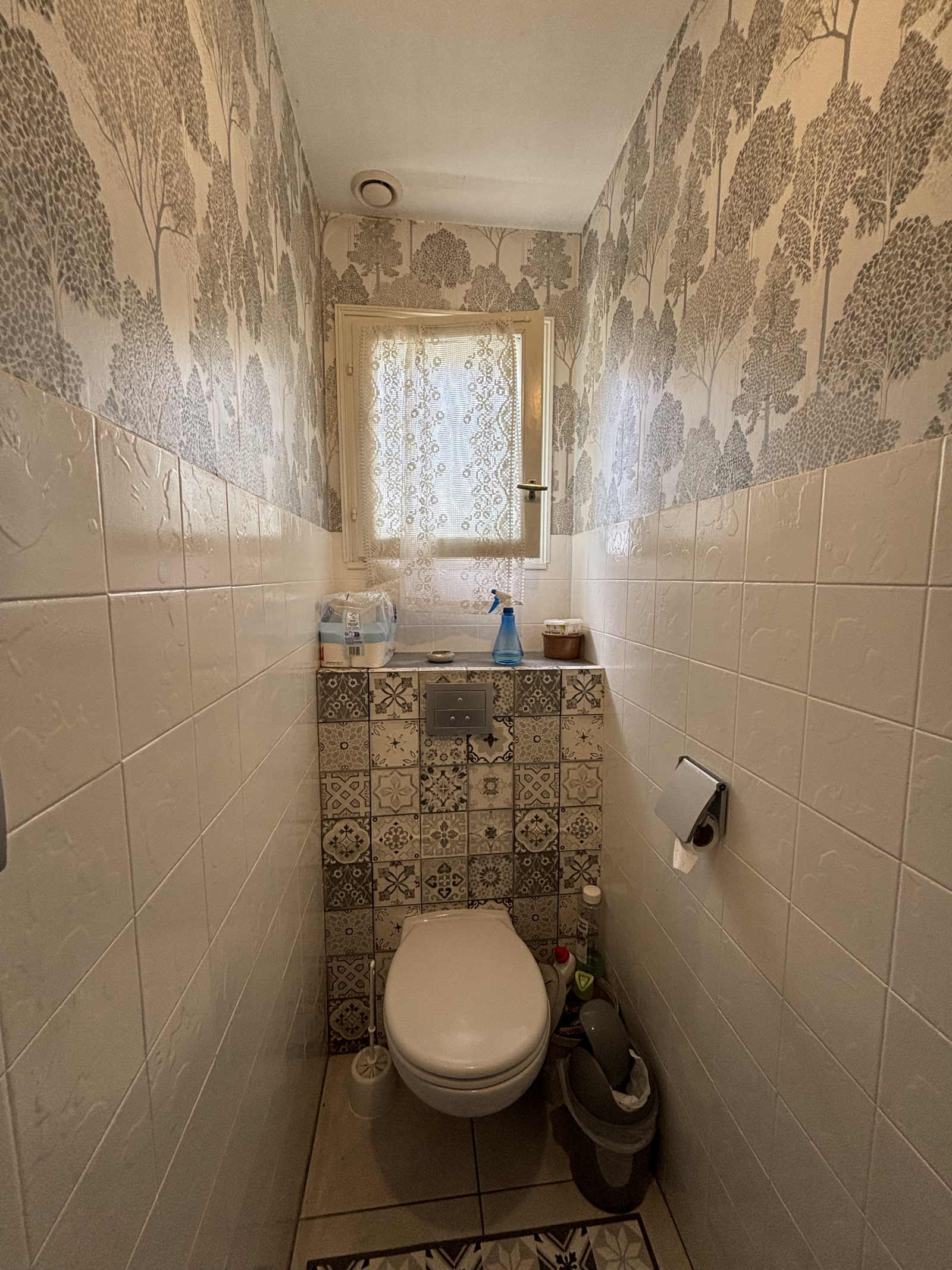 Chauffage principal par insert; radiateur électrique à inertie en complément. Raccordée au tout à l'égout.