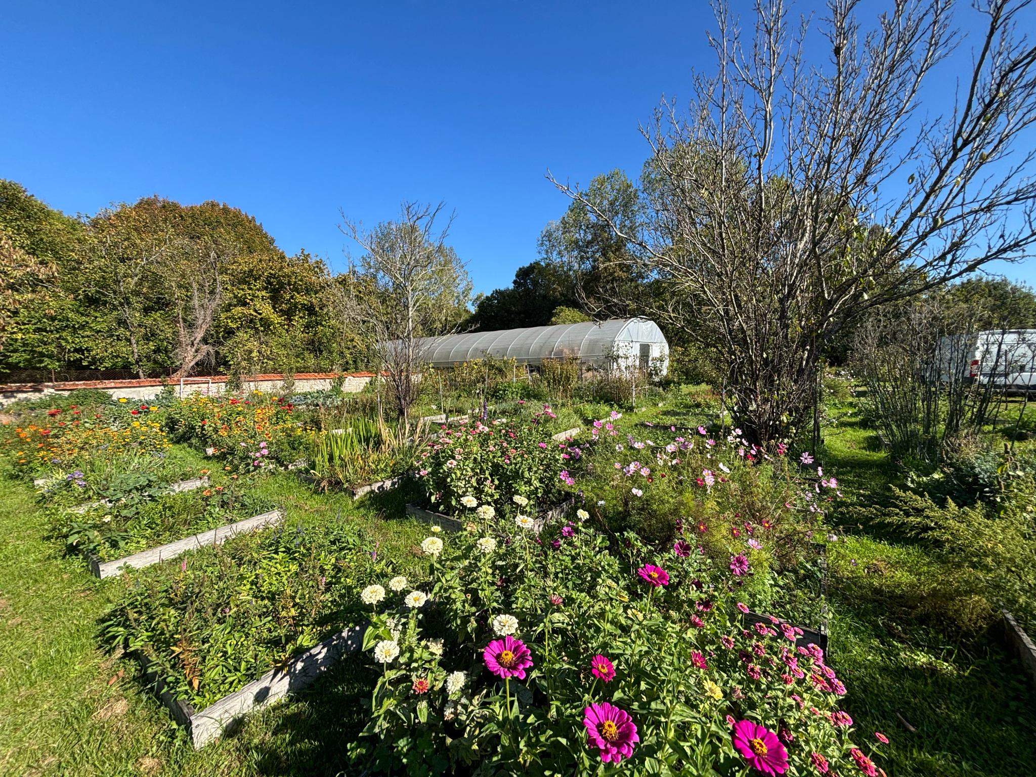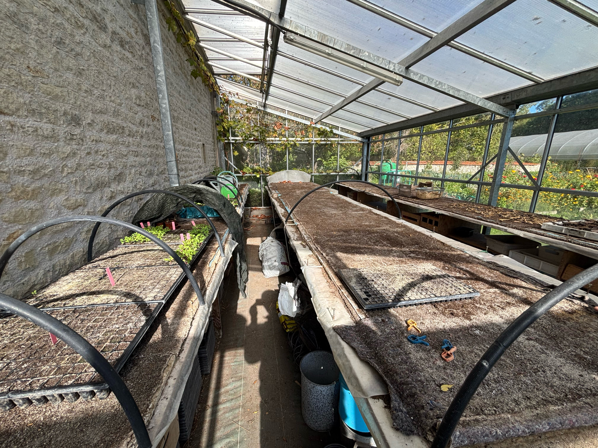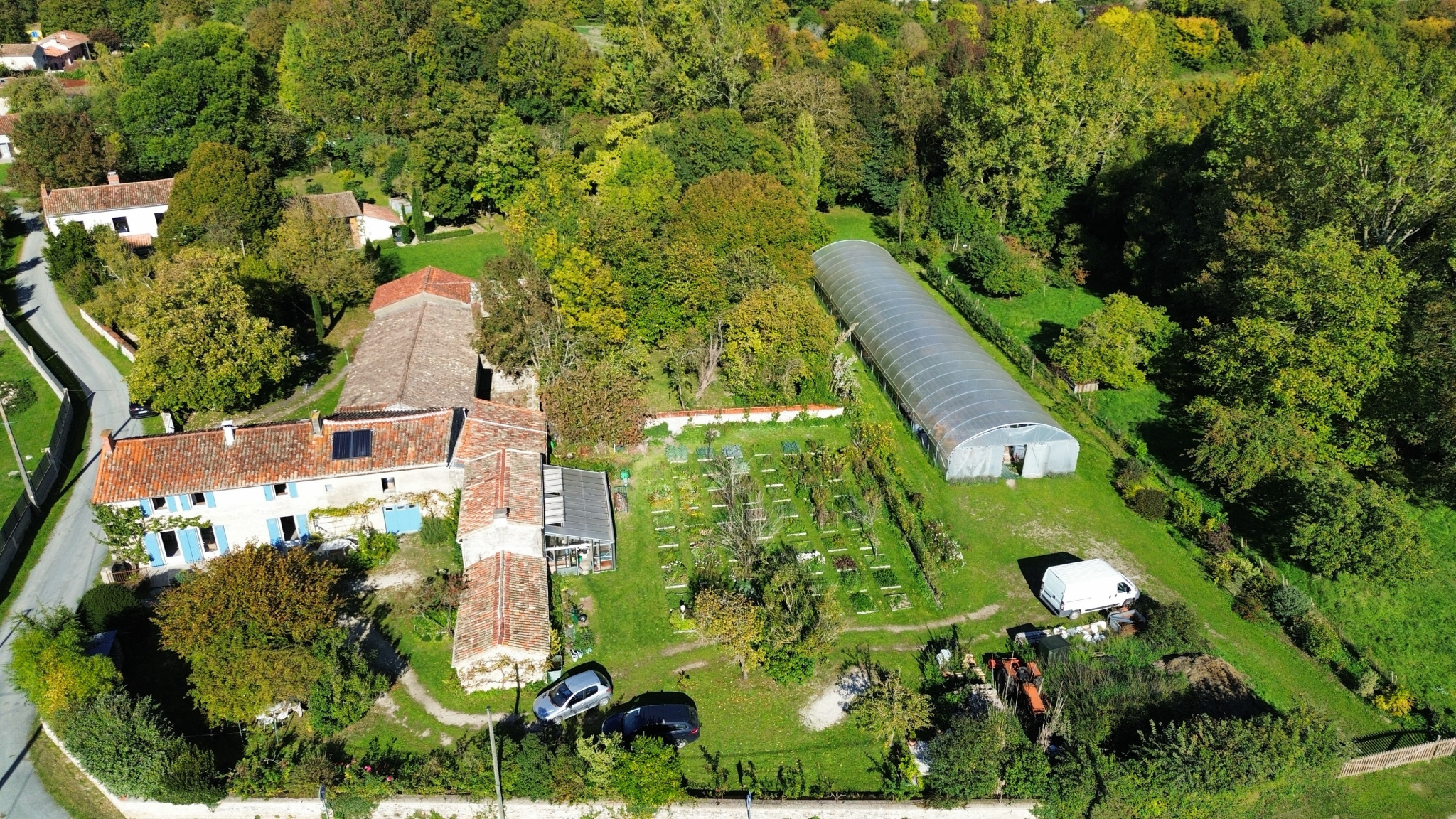 La propriété comprend un grand tunnel maraicher (378m2), une serre (32m2) et plus d'une soixantaine de carrés potagers, ce qui réjouira les passionnés de jardinage. Un puits et un système enterré de récupération des eaux de pluie permettent d'en assurer l'arrosage.