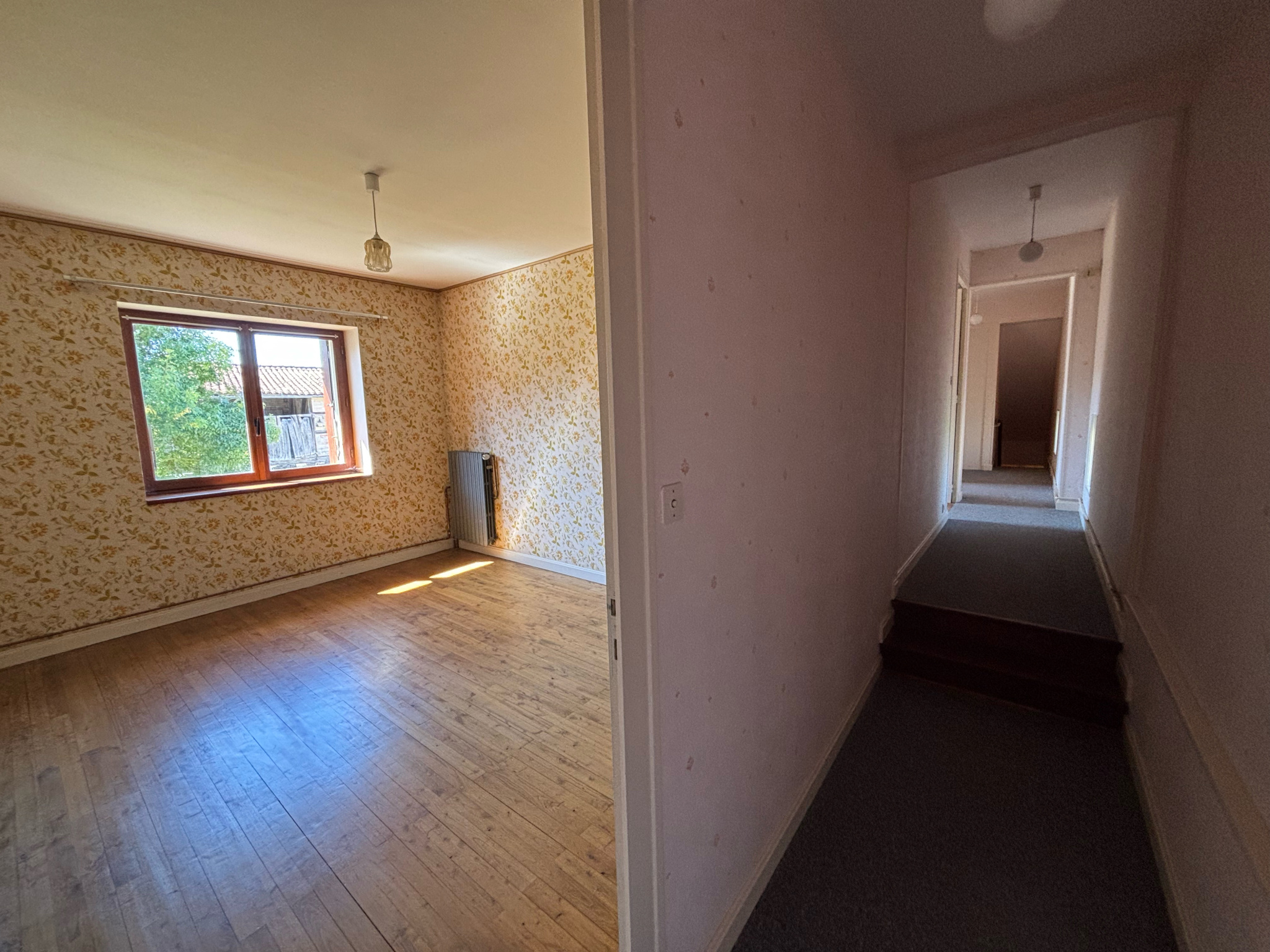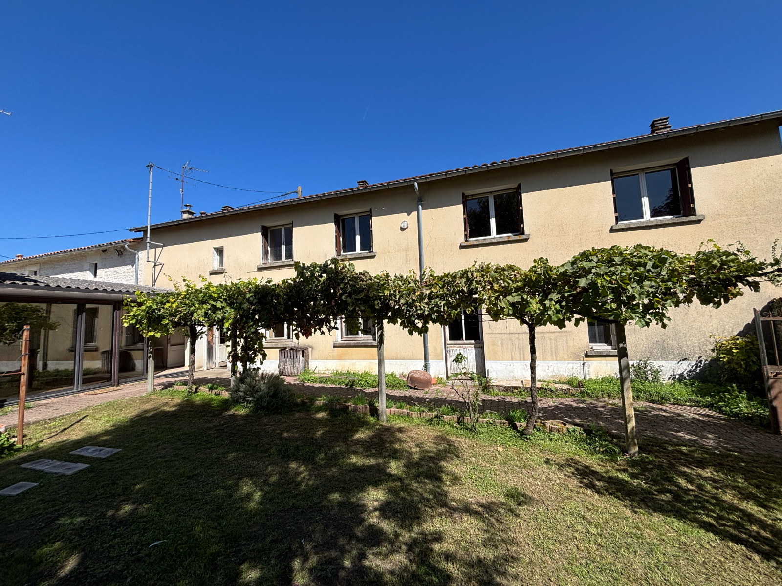 Cette propriété se compose d'une longère idéalement exposée (Sud-Ouest) d'environ 140m2 habitables avec 3 chambres (potentiellement 4 ou 5). Salle d'eau et WC au RDC et à l'étage. Charmante véranda avec cheminée. Volets roulants électrique pour les fenetres du RDC..